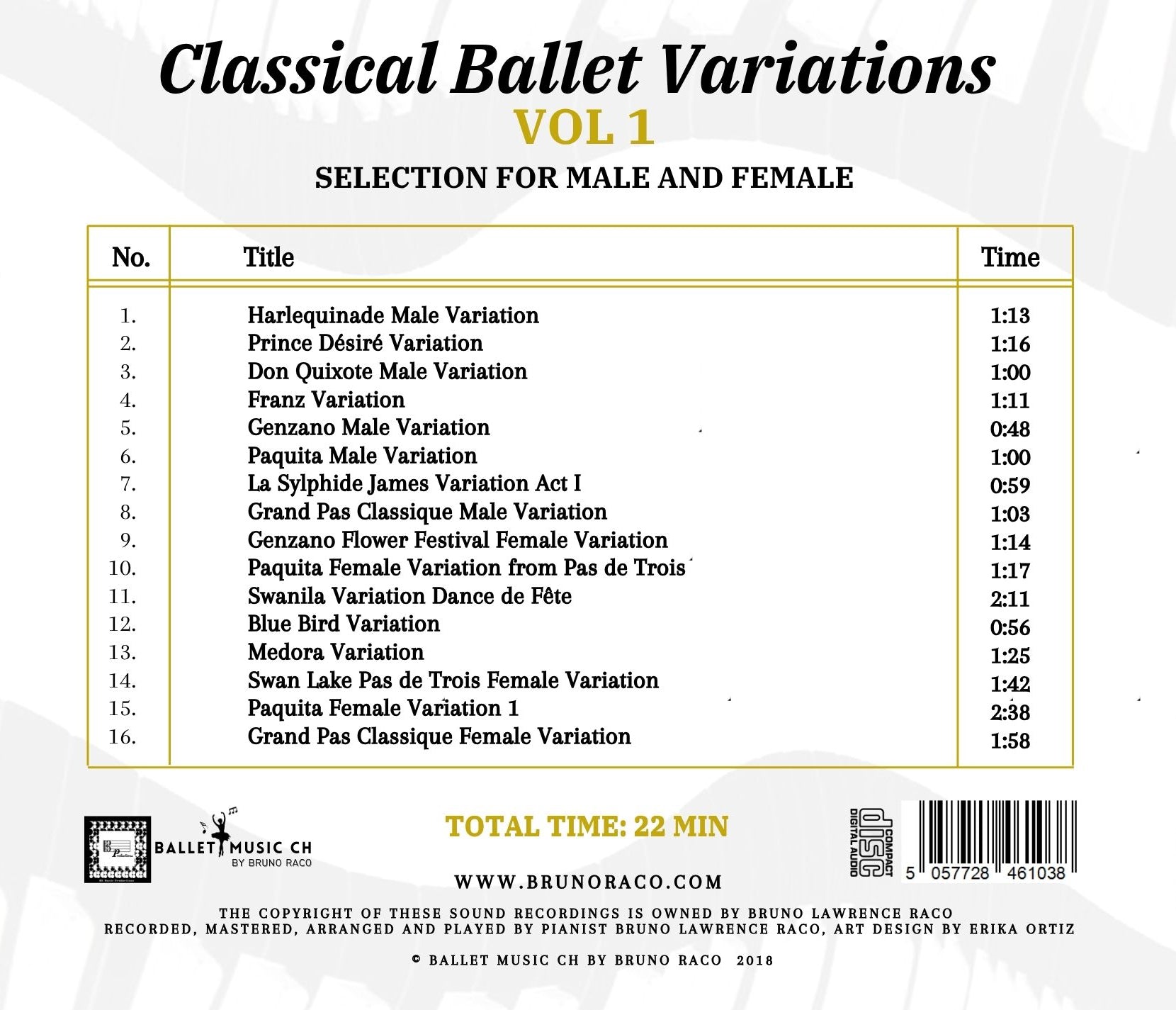 The CD contains 16 useful pieces of music for ballet variations. A special selection for Male and Female.